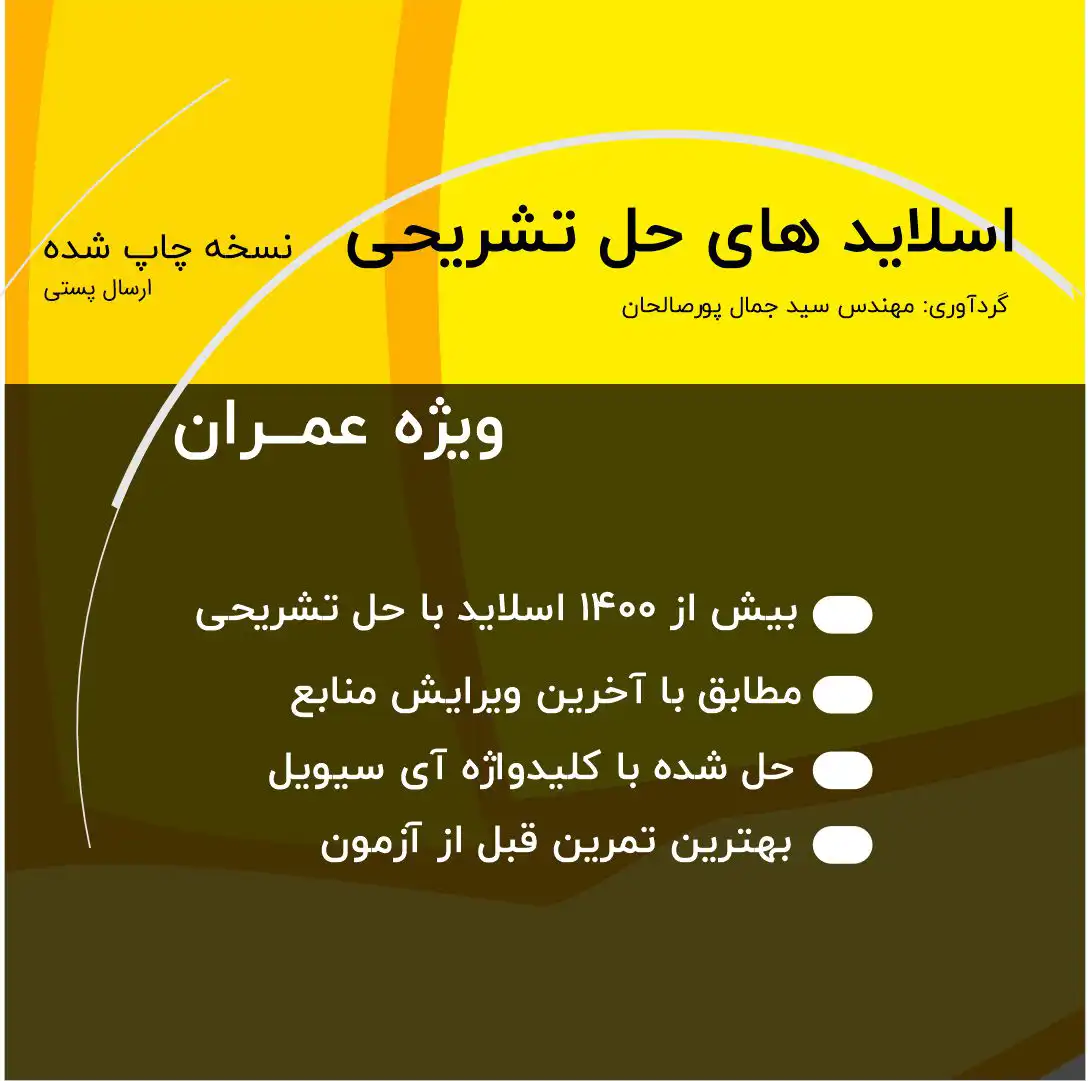 با توجه به درخواست بسیاری از همکاران بعد از دانلود رایگان فایل اسلاید های حل تشریحی جهت دریافت نسخه چاپی این مجموعه بسیار مفید جهت سهولت دسترسی کاربران و کاهش هزینه های چاپ آن ، آی سیویل اقدام به تهیه نسخه پرینت شده این فایل در فرمت مناسب چاپ کرده است . شما اکنون میتوانید نسخه چاپ شده این فایل را با توجه به رشته مورد نظر خود تهیه بفرمایید.